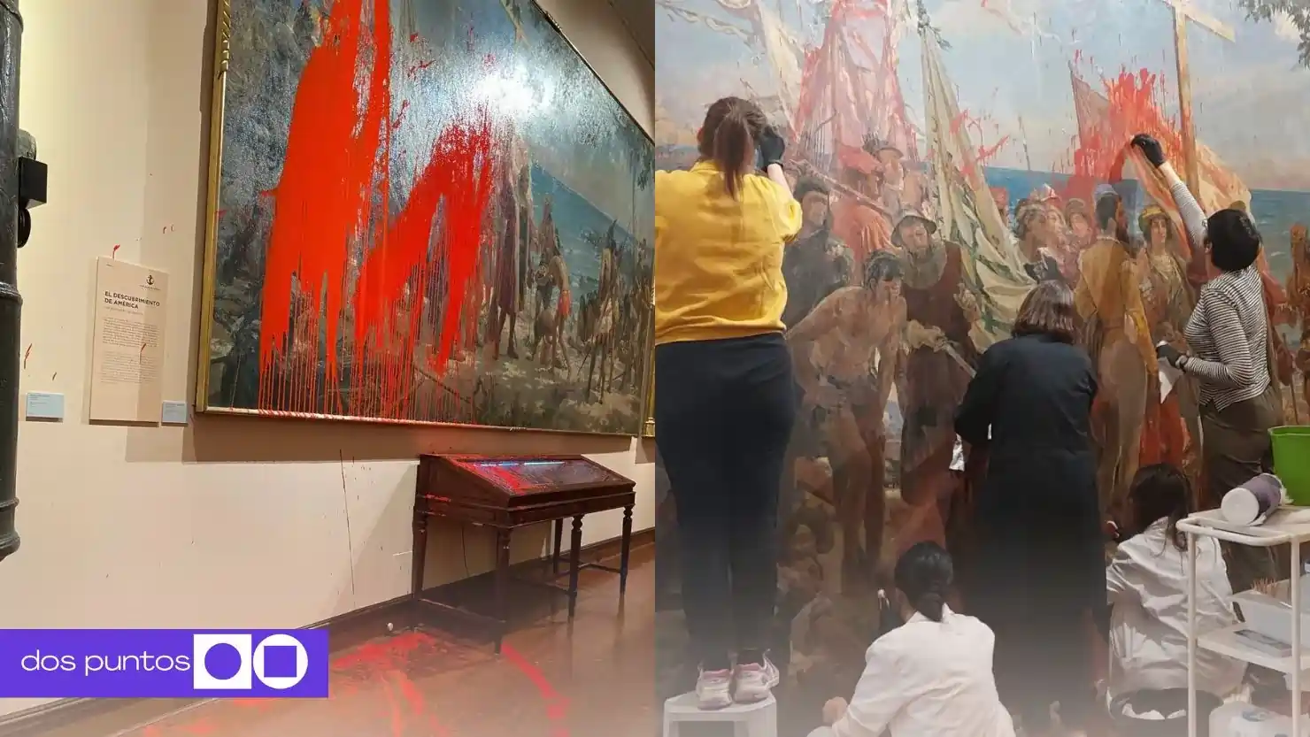 Detienen a las dos idiotas que han tirado pintura roja sobre el cuadro “El primer homenaje a Cristóbal Colón” (1892), de José Garnelo y Alda expuesto en el Museo Naval.